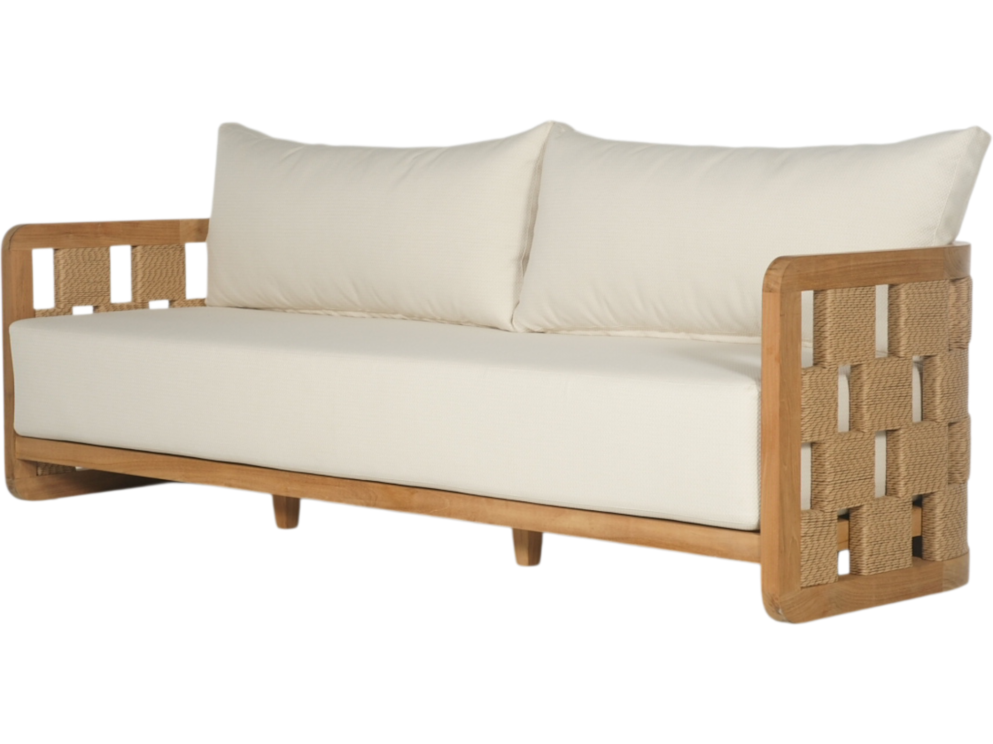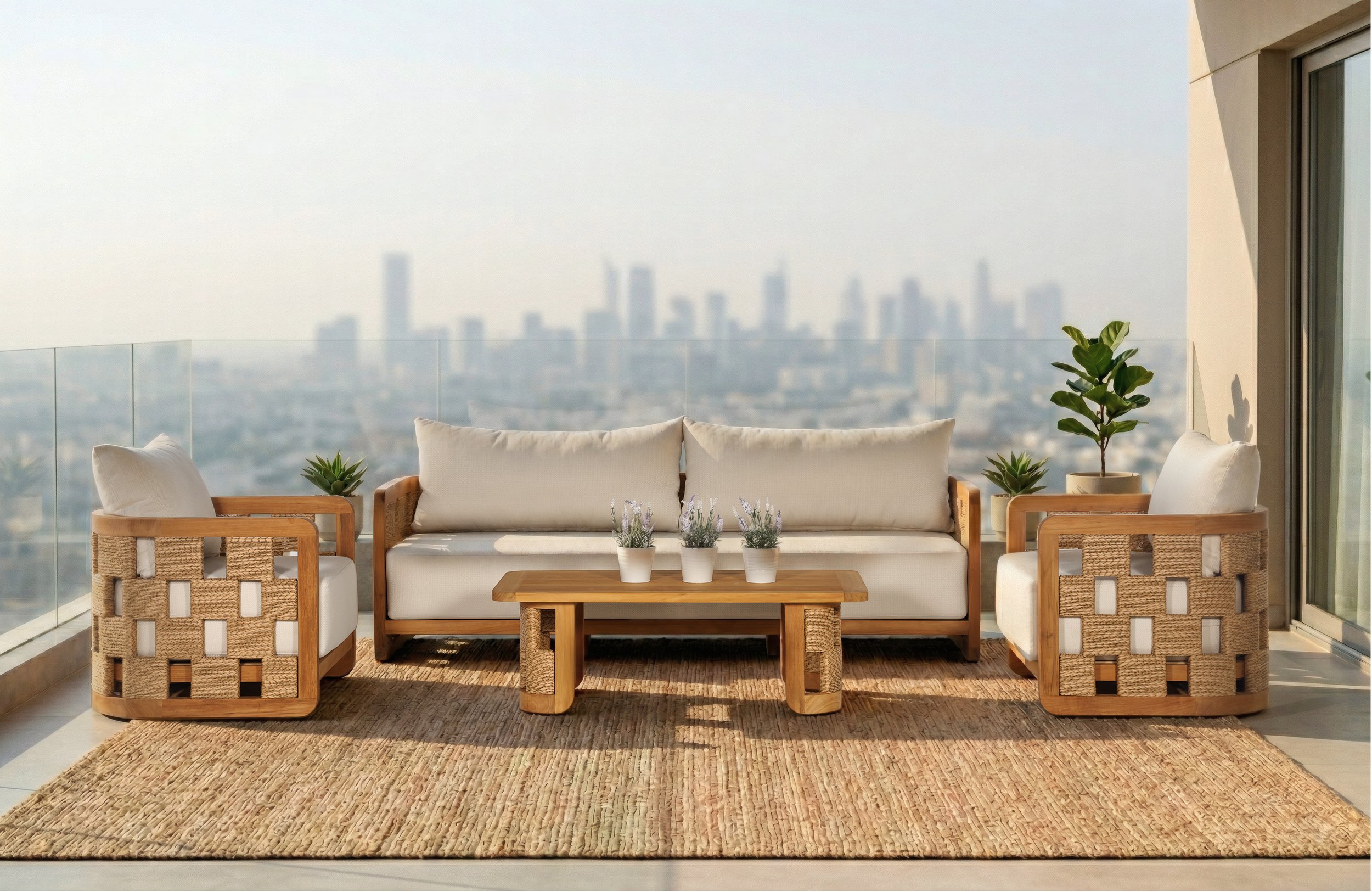 Transform your outdoor space into a coastal paradise with our luxurious patio furniture set. This elegant collection features a plush, beige sofa adorned with stylish patterned cushions, complemented by two matching armchairs with a unique woven design. The solid wood coffee table adds both functionality and charm, making it the perfect centerpiece for your patio. Set against the backdrop of a tranquil beach and azure waters, this ensemble captures the essence of relaxation and sophistication. Elevate your outdoor living experience with this timeless collection, designed for comfort and elegance on every occasion.