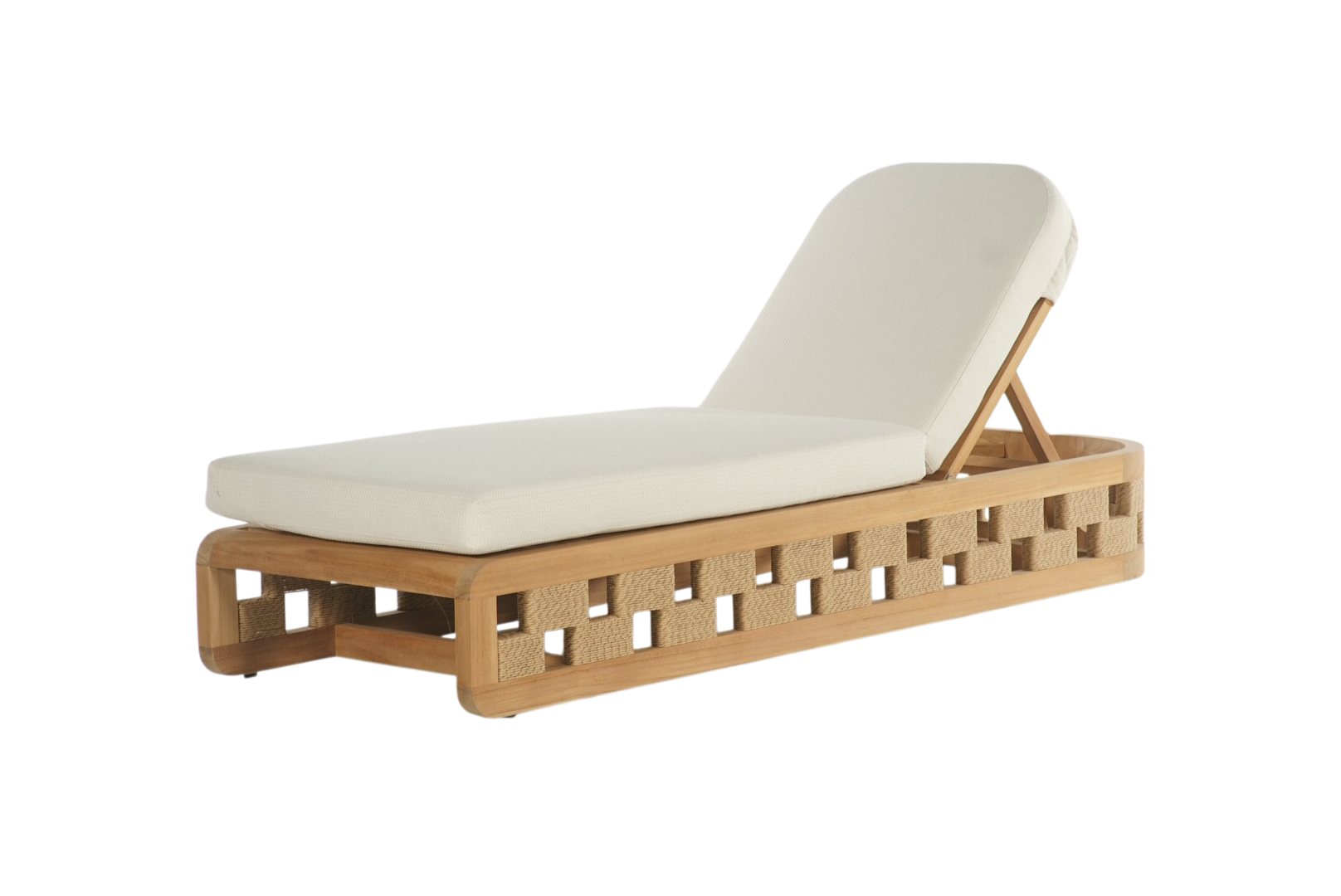 Escape to paradise with our luxurious outdoor chaise lounge, perfectly designed for ultimate relaxation. This elegant piece features a sturdy wooden frame with a stylish woven pattern, complemented by plush, weather-resistant cushions in a soothing neutral tone. The adjustable backrest ensures personalized comfort, while the vibrant chevron-patterned pillow adds a pop of color and modern flair. Set against the backdrop of a serene beach with crystal-clear waters and lush greenery, this chaise lounge invites you to unwind and soak up the sun in style.