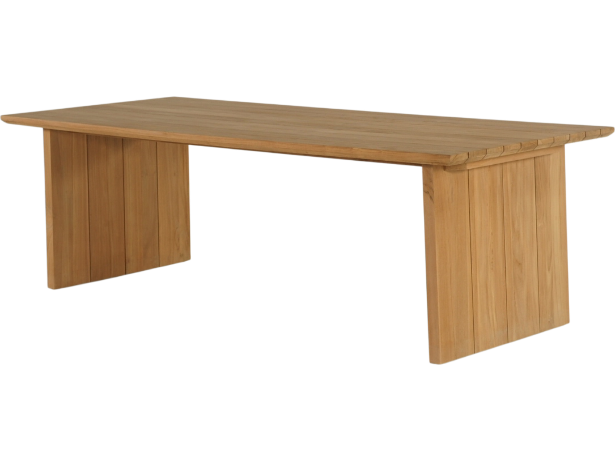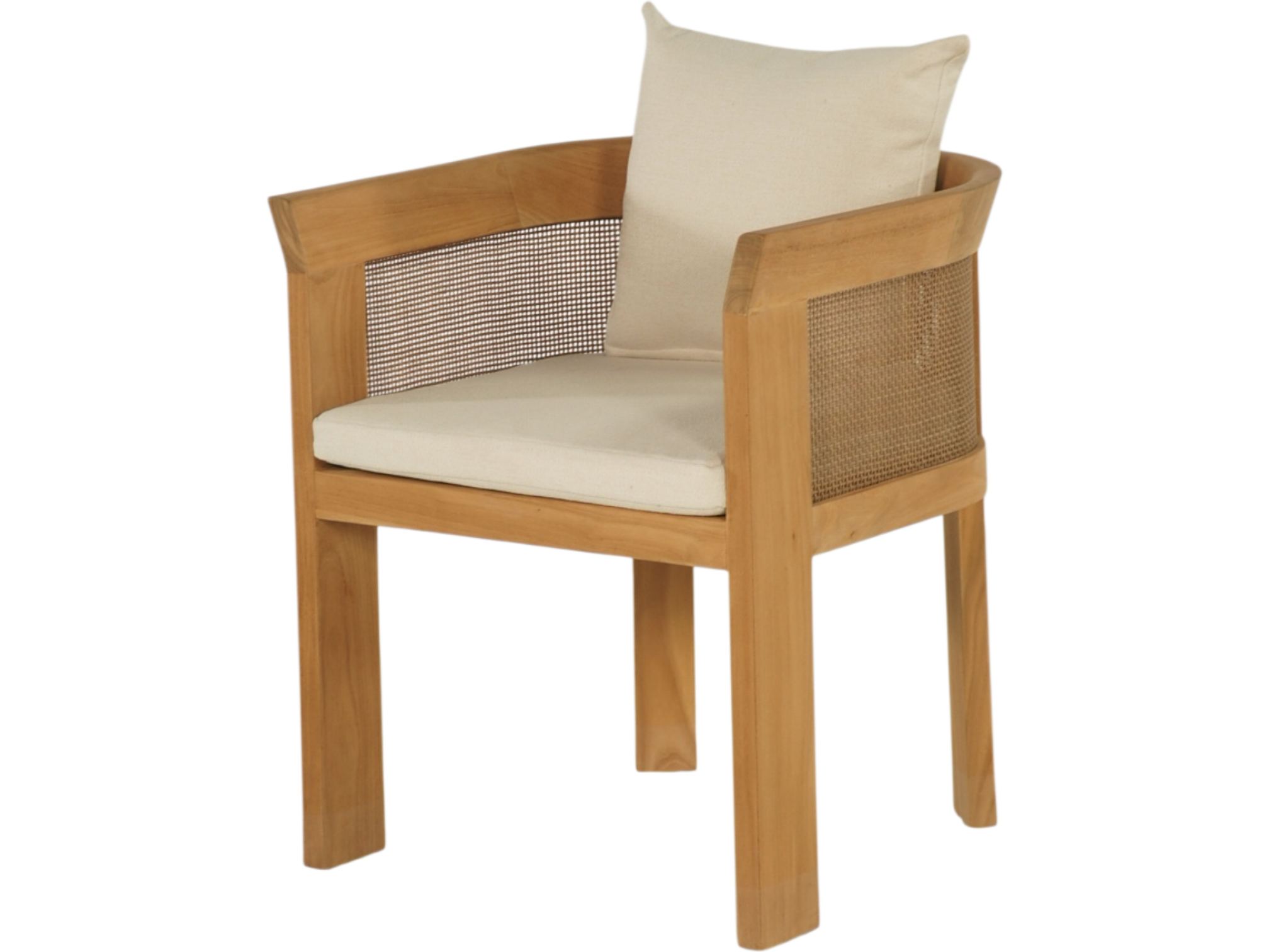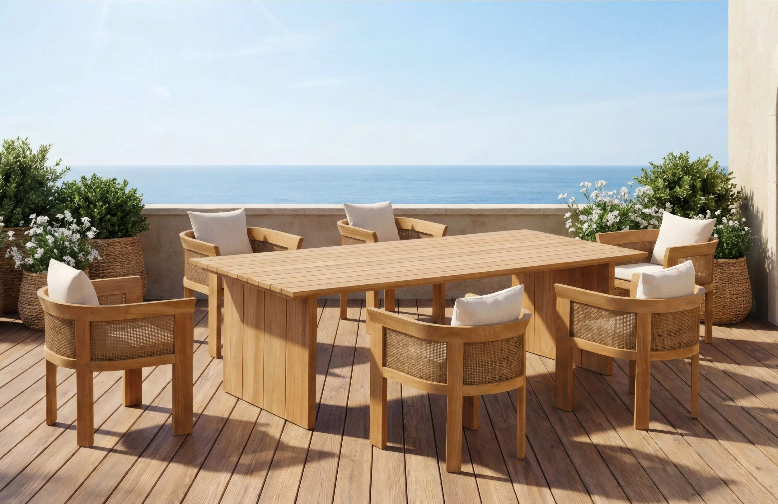 Each chair features a sturdy wooden frame and comfortable cushions, ensuring both style and comfort for your outdoor dining experience. The set is perfectly placed on a sophisticated stone patio, surrounded by lush green grass. Elevate your outdoor space with this exquisite combination of functionality and aesthetic appeal.