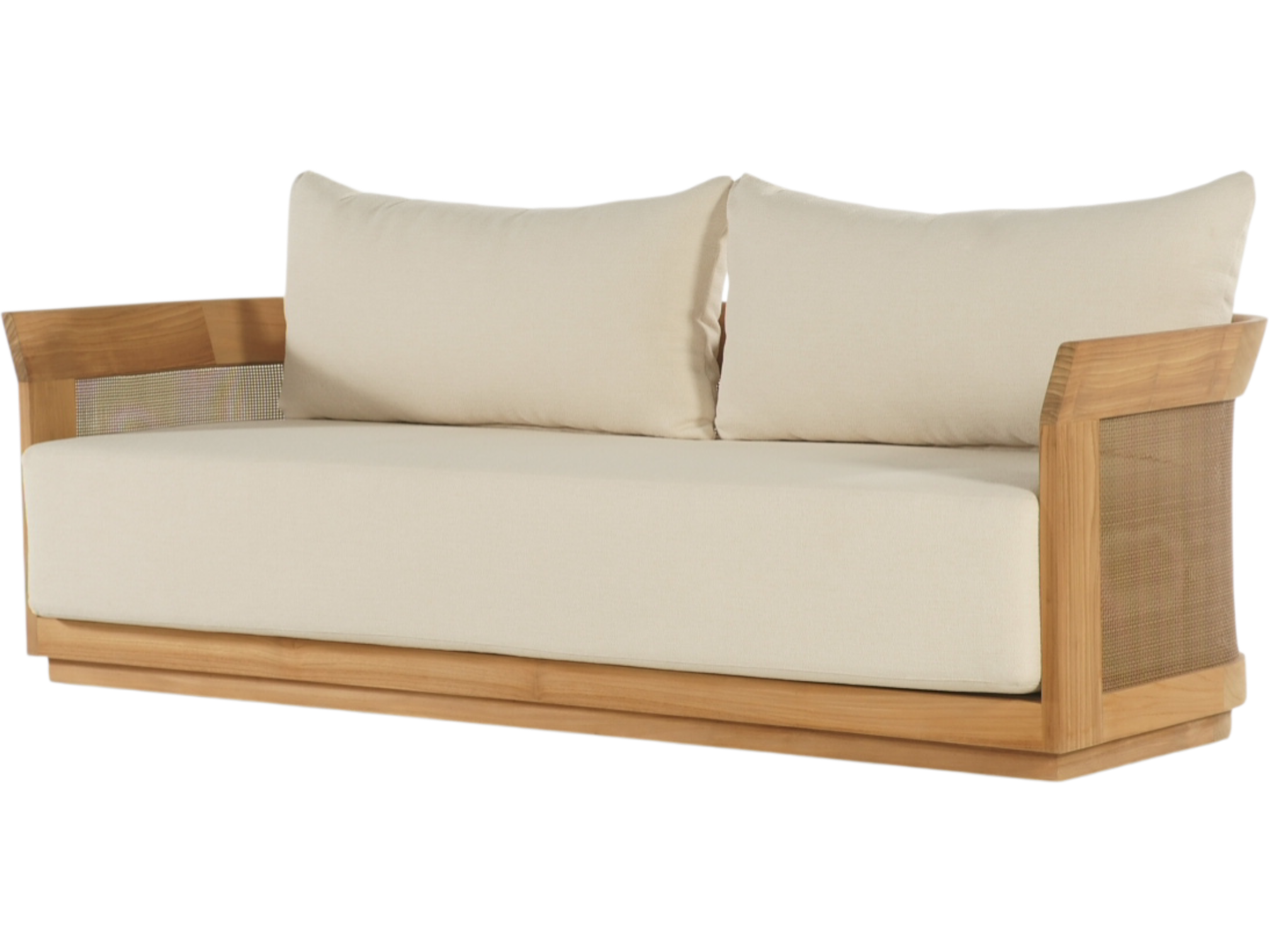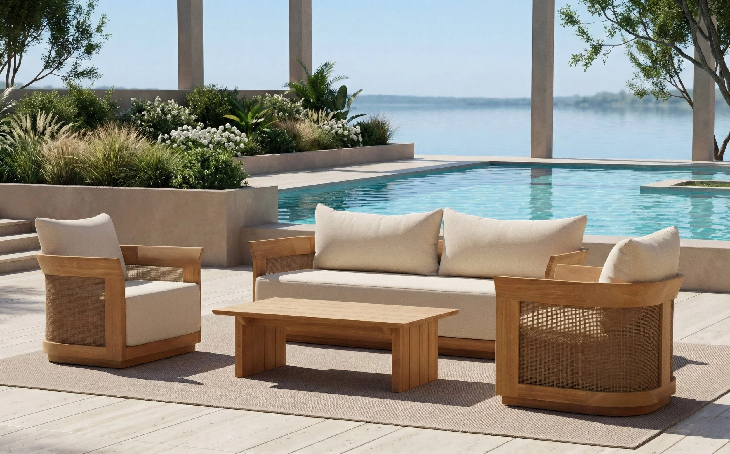 This exquisite ensemble features a spacious, plush sofa and two matching armchairs, all crafted with a perfect blend of natural wood and woven accents for a timeless aesthetic. The set is complemented by vibrant, patterned cushions in shades of yellow, green, and white that add a pop of color and comfort. The centerpiece is a sleek wooden coffee table that ties the whole look together. Ideal for any patio or terrace, this furniture set promises to transform your outdoor space into an elegant retreat where style meets relaxation.
