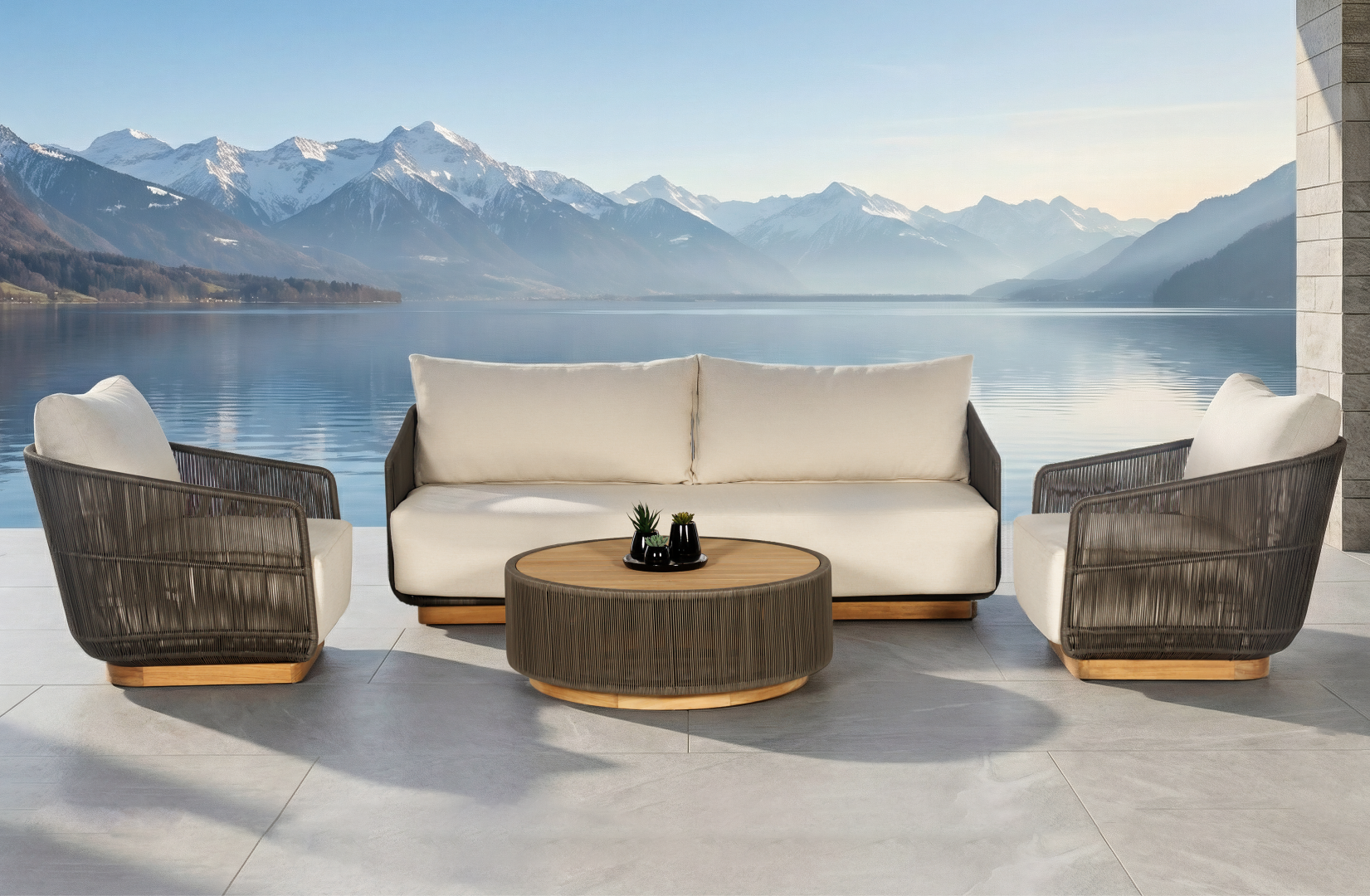 Transform your outdoor space into a coastal paradise with our luxurious patio furniture set. This elegant collection features a plush, beige sofa adorned with stylish patterned cushions, complemented by two matching armchairs with a unique woven design. The solid wood coffee table adds both functionality and charm, making it the perfect centerpiece for your patio. Set against the backdrop of a tranquil beach and azure waters, this ensemble captures the essence of relaxation and sophistication. Elevate your outdoor living experience with this timeless collection, designed for comfort and elegance on every occasion.